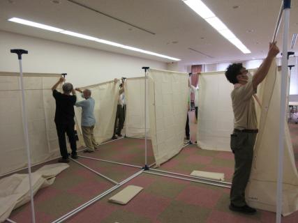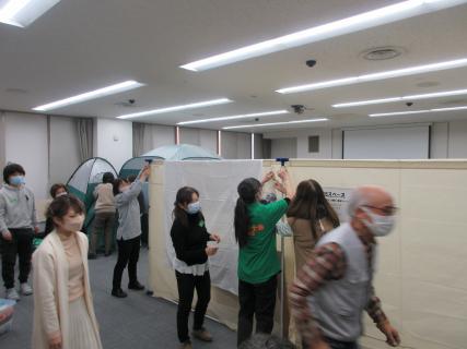 避難所設営体験では、資機材を組み立てながら、工夫するポイント、プライバシーの配慮、子どもたちの居場所づくり、などを設営した。