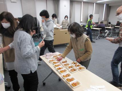 非常食の試食では、フリーズドライのご飯、バームクーヘン、クッキーなどを人数分の小皿に取り分け、試食しました。