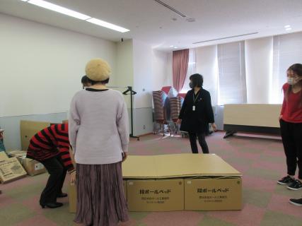 また、避難所で使用するダンボールベッド、プライベートテントの組み立ての実演を防災担当から説明を交えながら,注意点などを聞き、学んだ。