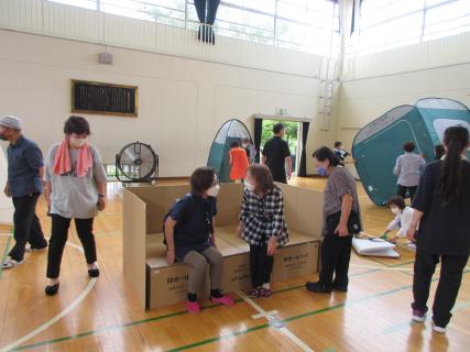 スライドで災害について学び、その後、資機材(プライベートテント、4部屋小部屋、ダンボールベッドなど)を組み立て、避難所の設営をしました。ダンボールベッドの寝心地を体感したり、どのようにプライバシーを配慮すれば良いかなどの意見交換をした。