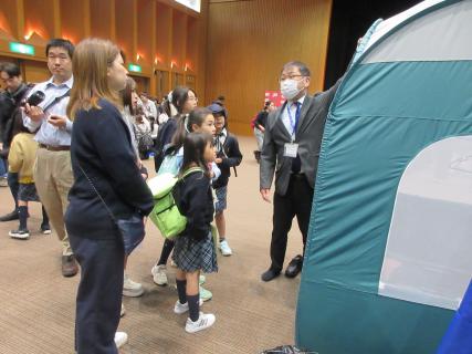 まず、災害が起きるとどうなるかのスライドを見てもらい、その後、避難所設営体験で、資機材(プライベートテント、4部屋小部屋、ダンボールベッド、簡易トイレ等)を組み立て、設営し、子どもの居場所、授乳室などプライバシーに配慮した設置などを説明しました。