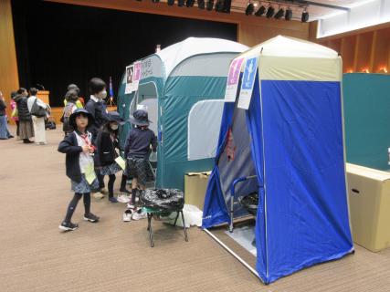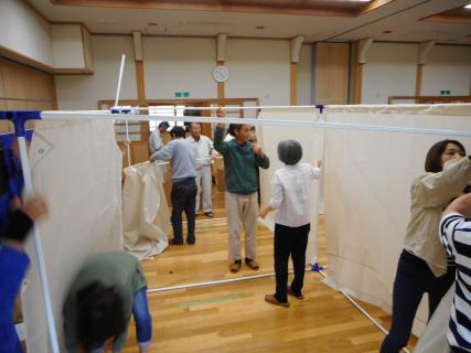 まず、災害が起きるとどうなるかのスライドを見てもらい、その後、避難所設営体験で、資機材(プライベートテント、ダンボールベッド、簡易トイレ等)を設営した。