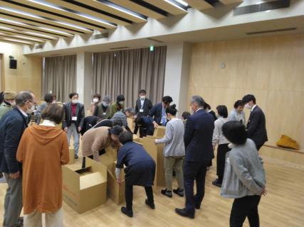 後半は、城陽市の備蓄品であるプライベートテント、ダンボールベッドを城陽市防災担当からの説明を聞き、参加者全員で組み立てました。