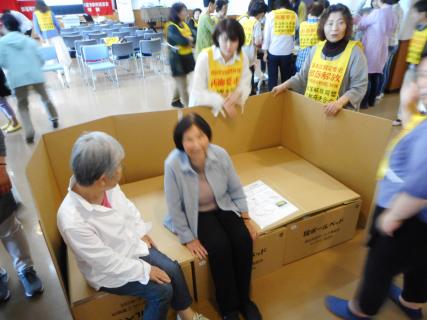 ダンボールベッドの寝心地や簡易トイレに座り、窮屈さを体感して、安心・安全を体験した。