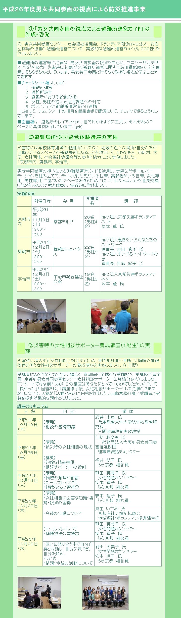 京都府男女共同参画センター らら京都では、男女共同参画視点からの防災事業(男女共同参画視点からの避難所設営講座、災害時女性相談サポーター養成講座、同養成講座修了生のフォローアップ講座、防災に関するセミナー開催。