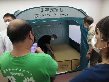 また、木津川市の備蓄品である、プライベートテント、ダンボールベッドを木津川市防災担当からの説明を聞き、参加全員で組み立てました。