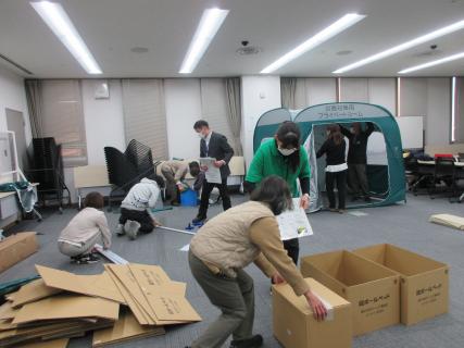 避難所設営では、ダンボールベッド、ワンタッチテント、トイレを組み立てました。