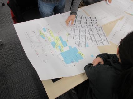 避難所を小学校として図面を拡大し、メインの避難所を体育館としました。最初は、ゆっくりと進めていき、避難してきた家族構成、年齢、一人ひとりの状況に配慮しながら、どの場所に適切に配置していくかを考えていきました。時間がたつと,避難者が続々と避難してくる状況をスピーどっを持って体感していきました。