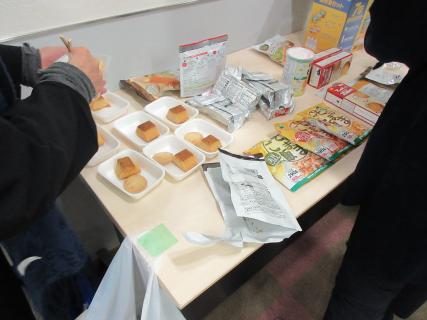 非常食の試食では、フリーズドライのご飯、バームクーヘン、クッキーなどを人数分の小皿に取り分け、試食しました。