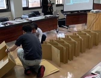 スライドで災害について学び、その後、資機材(プライベートテント、4部屋小部屋、ダンボールベッドなど)を組み立て、避難所の設営をしました。ダンボールベッドの寝心地を体感したり、どのようにプライバシーを配慮すれば良いかなどの意見交換をした。