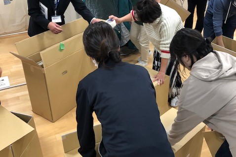 また、避難所で使用するダンボールベッド、プライベートテントの組み立ての実演を防災担当から説明を交えながら,注意点などを聞き、学んだ。