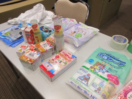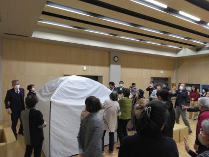 まず、災害が起きるとどうなるかのスライドを見てもらい、その後、避難所設営体験で、資機材(プライベートテント、4部屋小部屋、ダンボールベッド、簡易トイレ等)を組み立て、設営し、子どもの居場所、授乳室などプライバシーに配慮した設置などを説明しました。