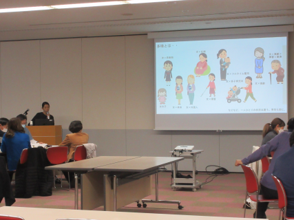 避難生活でのストレスや、避難所の運営、多様な視点、子どもの居場所、授乳室などプライバシーに配慮した設置などを説明しました。
