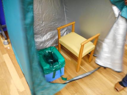 避難所設営体験では、4部屋小部屋、段ボールベッド、非常用トイレなどを作り、子どもの居場所や、男性と女性区分けしたり、プライバシーを守るなど、レイアウトを考えてもらうように伝えました。1部屋(2m×2m)で1家族では狭いし、隣の声が気になるなど、意見がありました。